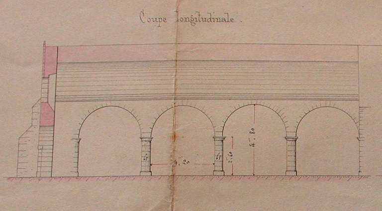 Coupe longitudinale partielle de l'ancienne église paroissiale, 31 août 1887 (Le Guerrannic, architecte / AD 22).Immatriculation