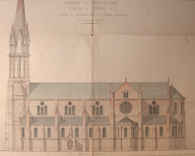 Coupe longitudinale n° 2 de l'église paroissiale d'après le premier projet daté du 31 août 1887 (Le Guerrannic, architecte / AD 22).Immatriculation