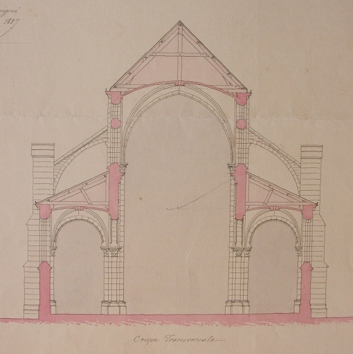 Coupe transversale de l'église paroissiale d'après le premier projet daté du 31 août 1887 (Le Guerrannic, architecte / AD 22).Immatriculation