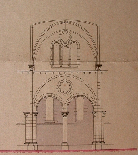 Coupe longitudinale d'une travée de la nef de l'église paroissiale d'après le premier projet daté du 31 août 1887 (Le Guerrannic, architecte / AD 22).Immatriculation