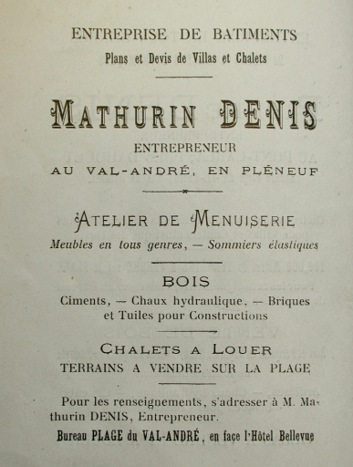 Dans : "Annuaire du Val-André" / Laveuve-Pony, Pléneuf-Val-André : Librairie Laveuve-Pony, s.d., p. 57.Encart publicitaire, 4e quart 19e siècle.