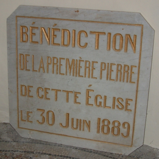 Plaque commérative de la bénédiction de la première pierre de l'église,