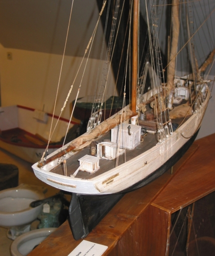 Maquette de la goélette Notre-Dame-de-la-Garde : vue de profil de l'arrière de la coqueImmatriculation