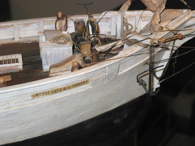 Maquette de la goélette Notre-Dame-de-la-Garde : vue de l'avant du navireImmatriculation