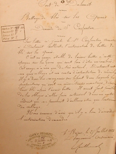 Lettre de l'ingénieur Guillemoto datée de 1884 reprenant l'argumentaire de l'armateur Carfantan pour l'usage du battage des blés sur les quais de Dahouët pendant l'été (AD 22)Immatriculation