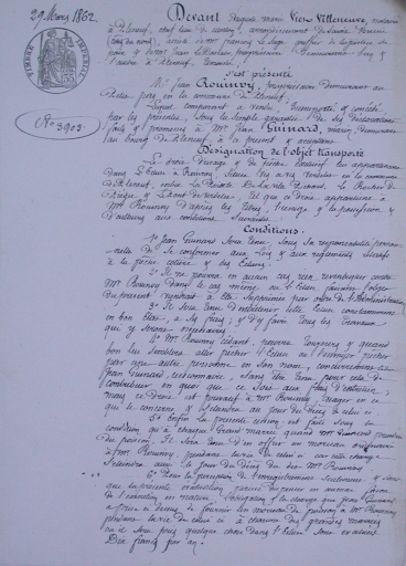 Acte de cession notariée de la pêcherie de Rouinvy, recto du manuscrit, 1862 (collection particulière)Immatriculation