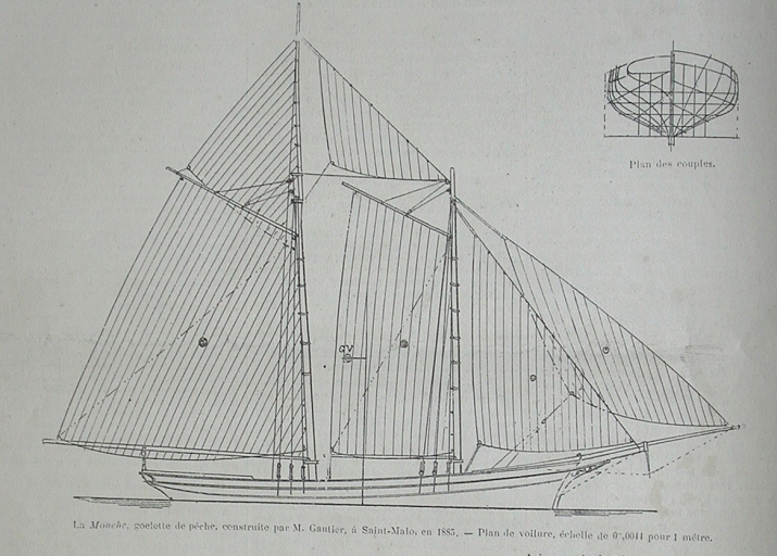 Plan de coque de la goélette de pêche la Mouche, construite par F. Gautier en 1885 (L'Illustration 1886)Immatriculation