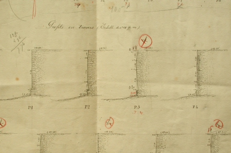 Dessin : projet d'exécution des nouveaux quais (profils en travers), présenté par Harel de la Noë, 1908 (AD 22)Immatriculation
