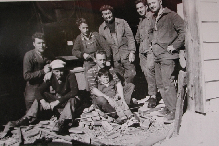 Les compagnons ouvriers du chantier Tocqué en 1962 près du premier hangar en boisImmatriculation