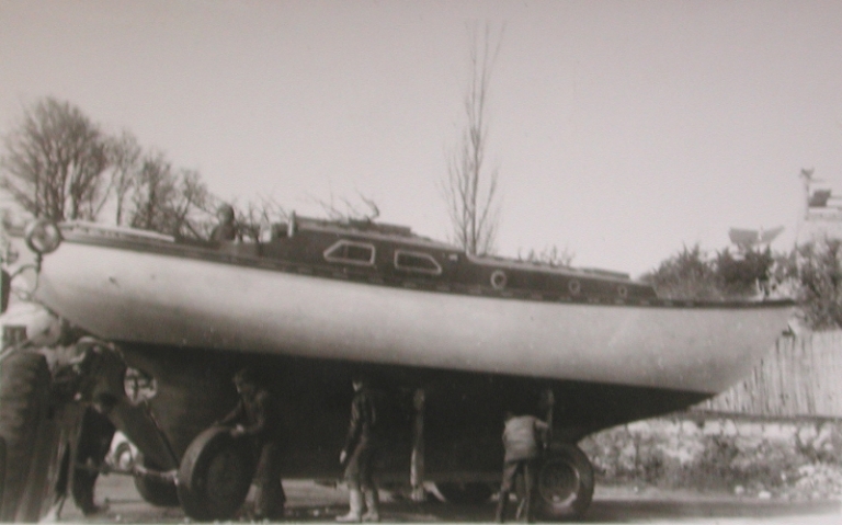 Vue générale du ketch Carusie II (type Cap Nord), construit par le chantier Tocqué en 1964, à son lancementImmatriculation
