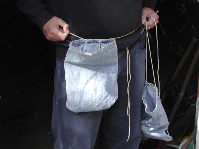 Sac en jean pour contenir les crevettes pêchées vivantes (collection particulière)Immatriculation