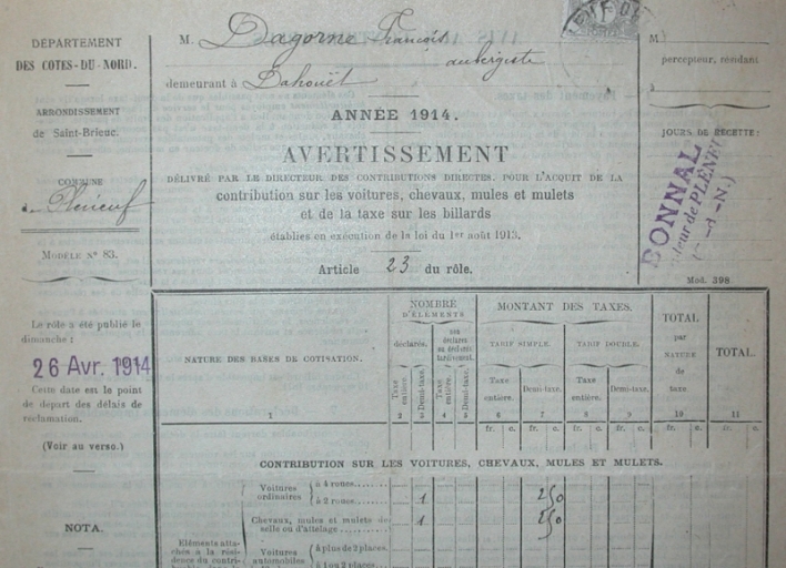Avertissement des contributions directes en 1914 à l'encontre de l'aubergiste François Dagorne (collection Grimaud)Immatriculation