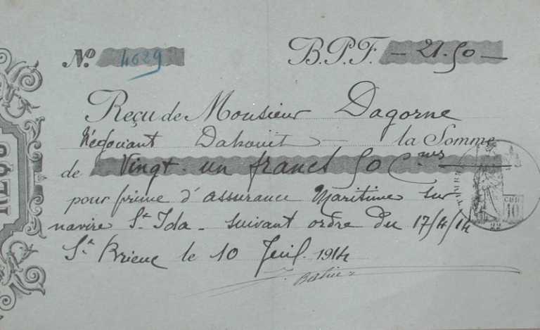 Reçu : prime d'assurance maritime de F. Dagorne sur le navire Saint-Iola en 1914 (collection Grimaud)Immatriculation