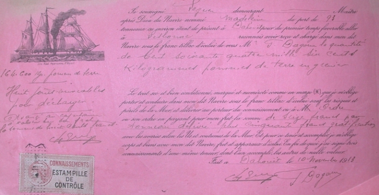 Charte-partie du navire Madeleine, frétée à Dagorne par le capitaine Leguen : livraison de pommes de terre en grenier pour Lisbonne, 1913 (collection Grimaud)Immatriculation