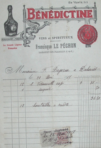 Facture de commande de boisson adressée par Francisque Le Péchon (vins et spiritueux) à la Maison Dagorne en 1917Immatriculation
