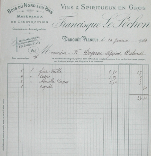 Facture de F. Le Péchon à Dagorne, 1914 : bières, eaux gazeusesImmatriculation