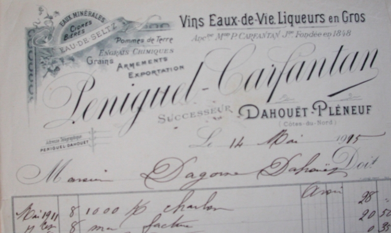 Facture de la maison Péniguel-Carfantan à Dagorne (collection Grimaud)Immatriculation