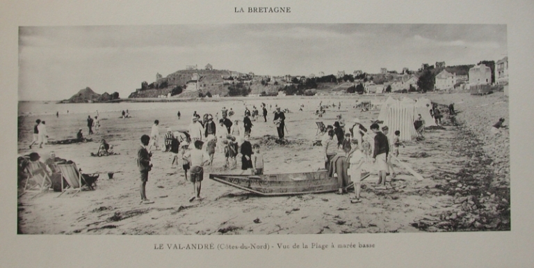 La plage du Val-André au 2e quart du 20e siècle, avec les cabines de plage en toile et les baigneursImmatriculation