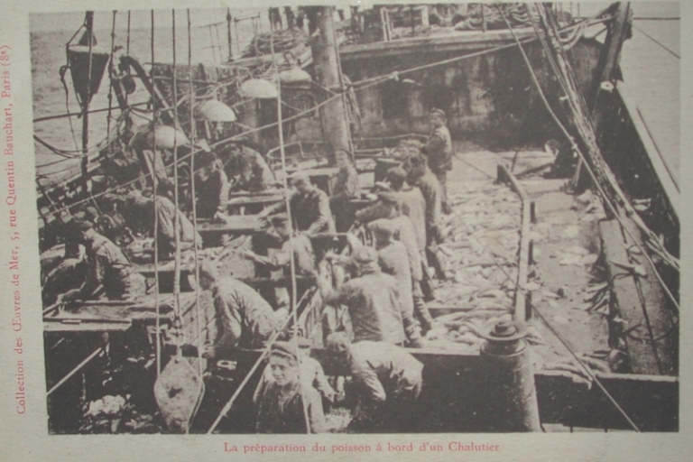 Triage de la morue sur un chalutier de grande pêche, du type de ceux où embarquait Michel Grimaud (collection Grimaud)Immatriculation