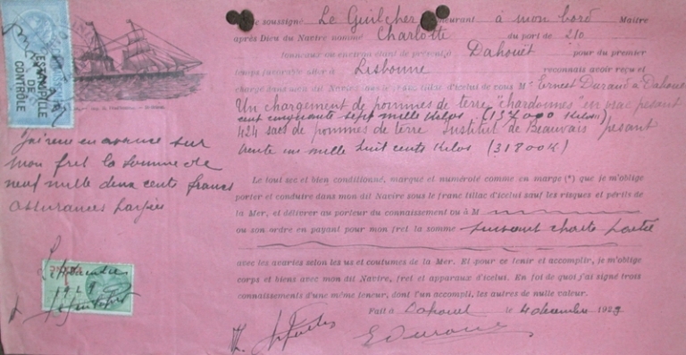 Connaissement pour le chargement du navire Charlotte du capitaine Le Guilcher, affrétée en 1929 par la maison Durand.Immatriculation