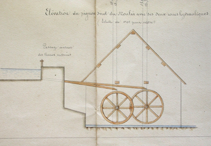 Elévation du pignon sud du moulin avec ses deux roues à augets, détail (1871).Immatriculation