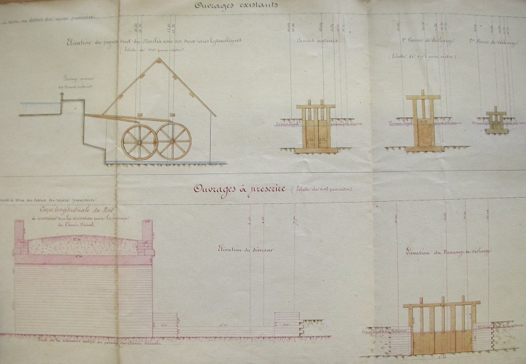 Elévation du pignon sud du moulin et ouvrages régulateurs (1871).Immatriculation