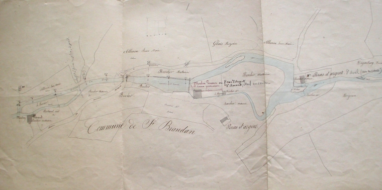 Plan de situation de l'usine du Bras d'Argent dressé lors d'un règlement d'eau (28 août 1851). Le moulin à papier sera édifié en 1853.Immatriculation