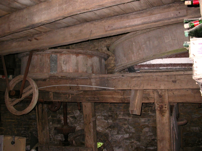 Vue des deux paires de meules subsistant dans le moulin.Immatriculation