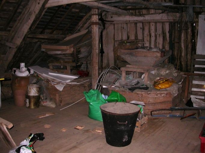 Le moulin, vue intérieure du premier étage : les deux paires de meules.Immatriculation