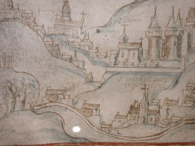 Parchemin de Marc du Ruffay sur la ville de Moncontour avec vue des moulins de Saint-Michel (1698).Immatriculation