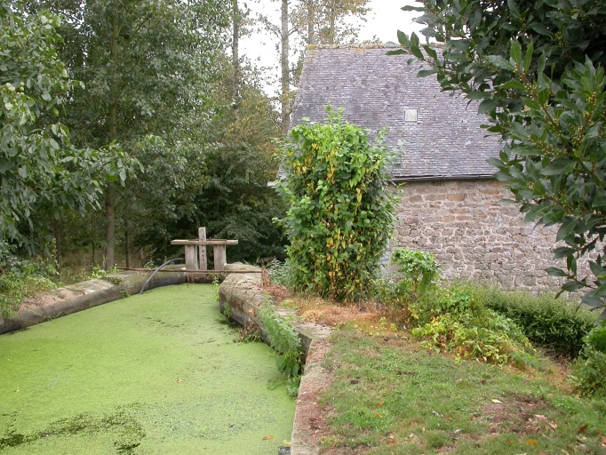 Vue générale d'une partie du bief amont, de la vanne motrice et du moulin.Immatriculation