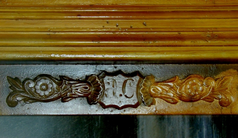 Rez-e-chaussée, pièce est, cheminée, détail du monogramme A.C(arer)Immatriculation