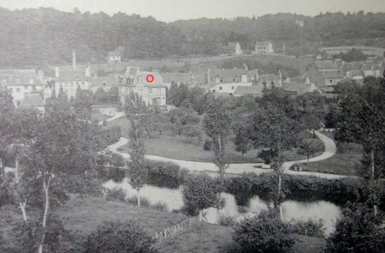 Vue du site avec la rivière de l'Ellé et le jardin. Carte postale, vers 1910Immatriculation