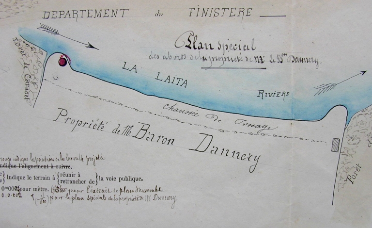 Extrait du plan de la rivière de la Laïta, 1877. Détail. Croquis accompagnant le rapport de l'ingénieur des Ponts et Chaussées (A.D. Finistère, 7 S 51)Immatriculation