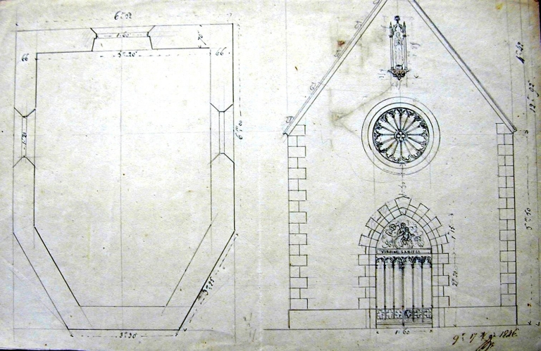 Plan et élévation de la chapelle par Joseph Bigot, 1846 (A.E. Quimper, 8 L. Fonds Bigot)Immatriculation