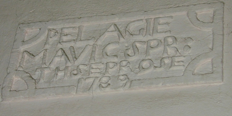 Mur est de la salle de sport : remploi d'une pierre gravéeImmatriculation