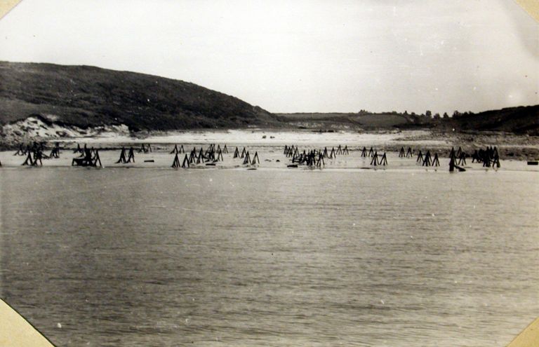 Vue de la plage au Sud de la pointe du Renard avec ses obstacles et obstructions anti-débarquement, n° 82, rapport Pinczon du Sel. Livre IV, vers 1947, Service Historique de la Marine, BrestImmatriculation