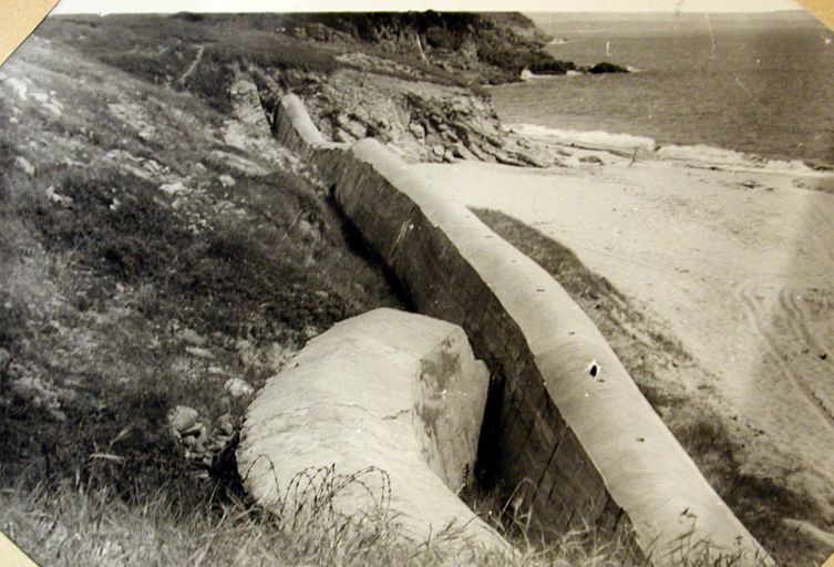Vue des obstructions et défenses anti-débarquement de la plage de Trégana : mur antichars brisé par les mouvements du sable, n° 91, rapport Pinczon du Sel. Livre IV, vers 1947, Service Historique de la Marine, BrestImmatriculation