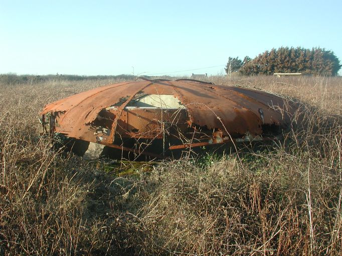 Vue du poste de télémétrie (état en 2003). Il conserve sa couverture en tôle assemblée par rivetageImmatriculation