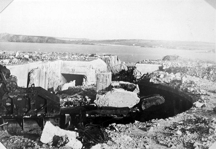 Vue de l'un des quatre canons Schneider de 22 cm K.552 modèle 1917 (f) montés en cuve, extrait du rapport Pinczon du Sel, photographie n° 124, vers 1946-1947Immatriculation