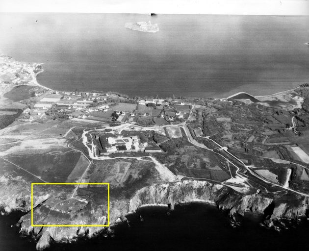 Vue aérienne des fortifications de Quélern en 1971 : en jaune, la batterie de TremetImmatriculation