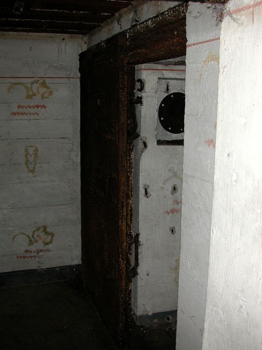 Vue de l'abri à personnel de type 128 des Quatre Pompes : sas d'entrée, la porte coulissante blindée et son décor peintImmatriculation