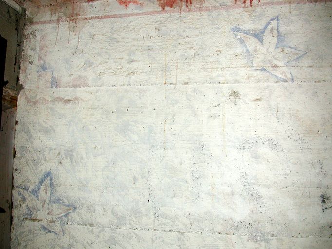 Vue de l'abri à personnel de type 128 des Quatre Pompes : décor peint floral du couloir d'entréeImmatriculation