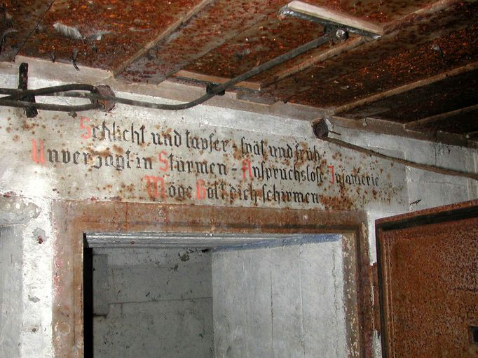 Vue de la casemate de type 515 de Maison Blanche : marquage allemand. Simple et Brave - Matin et Soir - Intrépide dans les assauts - Modeste infanterie, que Dieu te protège !Immatriculation