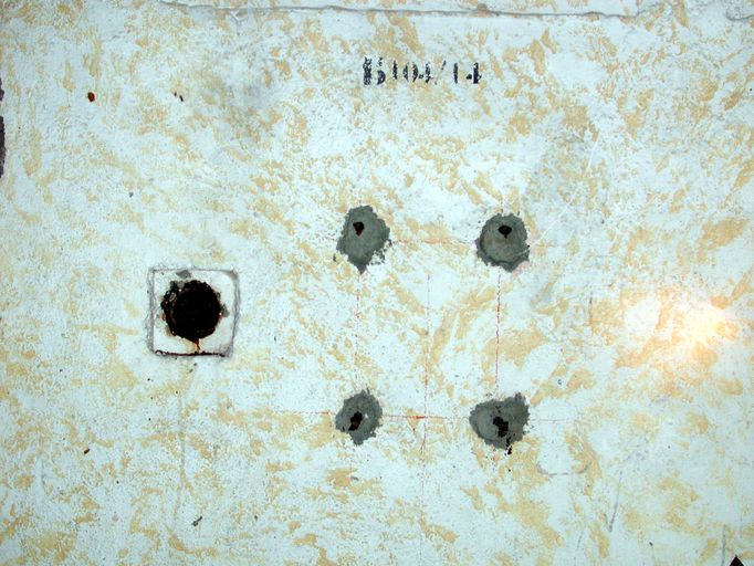 Vue de la casemate de type 505 face au Hildy : marquage : B 104 / 14 placé au dessus de l'emplacement du central téléphonique. A noter la peinture jaune imitant une tapisserieImmatriculation