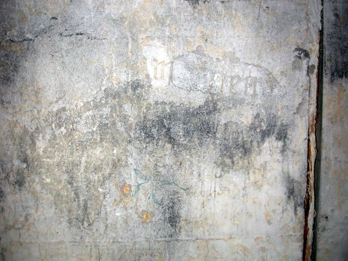 Vue de l'abri pour canon antichars type 601 : les murs de la chambre de troupe conservent de nombreuses traces de peintures murales, décor floral et inscriptionsImmatriculation