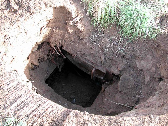 Vue du puits de la cloche bindée : trappe d'accès (état en 2003). L'entrée principale du bunker étant remblayée, le puits de la cloche blindée constitue le seul accèsImmatriculation