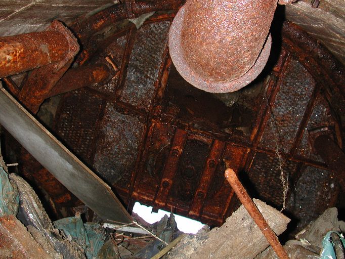 Vue du puits de la cloche bindée : remontée au milieu des détritus (état en 2003). L'entrée principale du bunker étant remblayée, le puits de la cloche blindée constitue le seul accèsImmatriculation