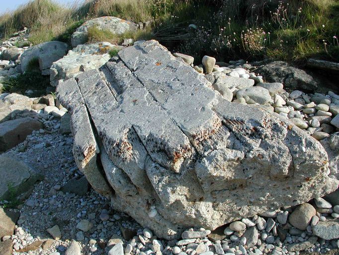 Vue de l'ensemble fortifié de Penn Enez. Sur la grève, de nombreux blocs de béton provenant d'une casemate détruiteImmatriculation