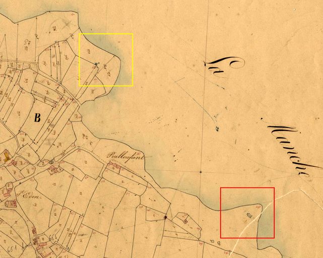 Plan de situation du corps de garde (encadré en rouge) et de la poudrière de Saint-Eden (en jaune), extrait du cadastre ancien, vers 1837, Archives Départementales du FinistèreImmatriculation